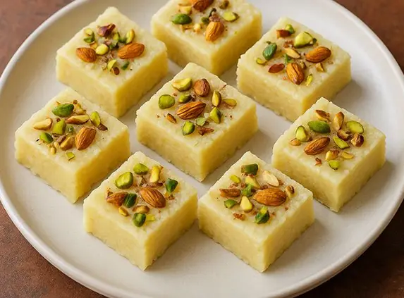 Garnish with nuts and your Sugar Free Khoya Barfi is ready to serve!