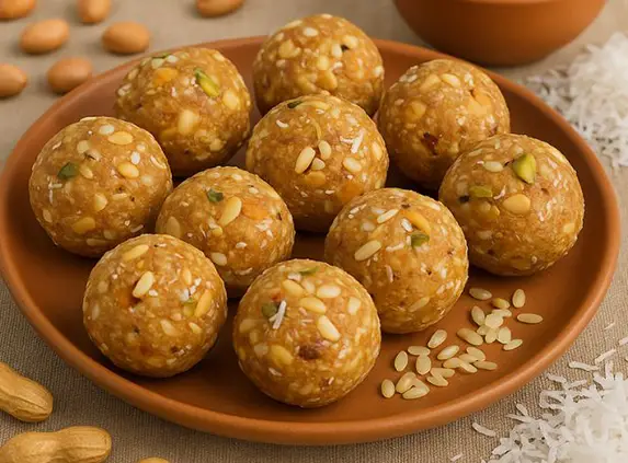 • Peanut laddu or Shengdana Ladoo is a traditional Indian sweet recipe made with groundnuts, often prepared during festivals like Ganesh Chaturthi. Many people also mix coconut, seeds and roasted dry fruits into this recipe for extra crunch and nutrition. Commonly these laddus are mixed with dates or jaggery to bind the mixture and add natural sweetness.